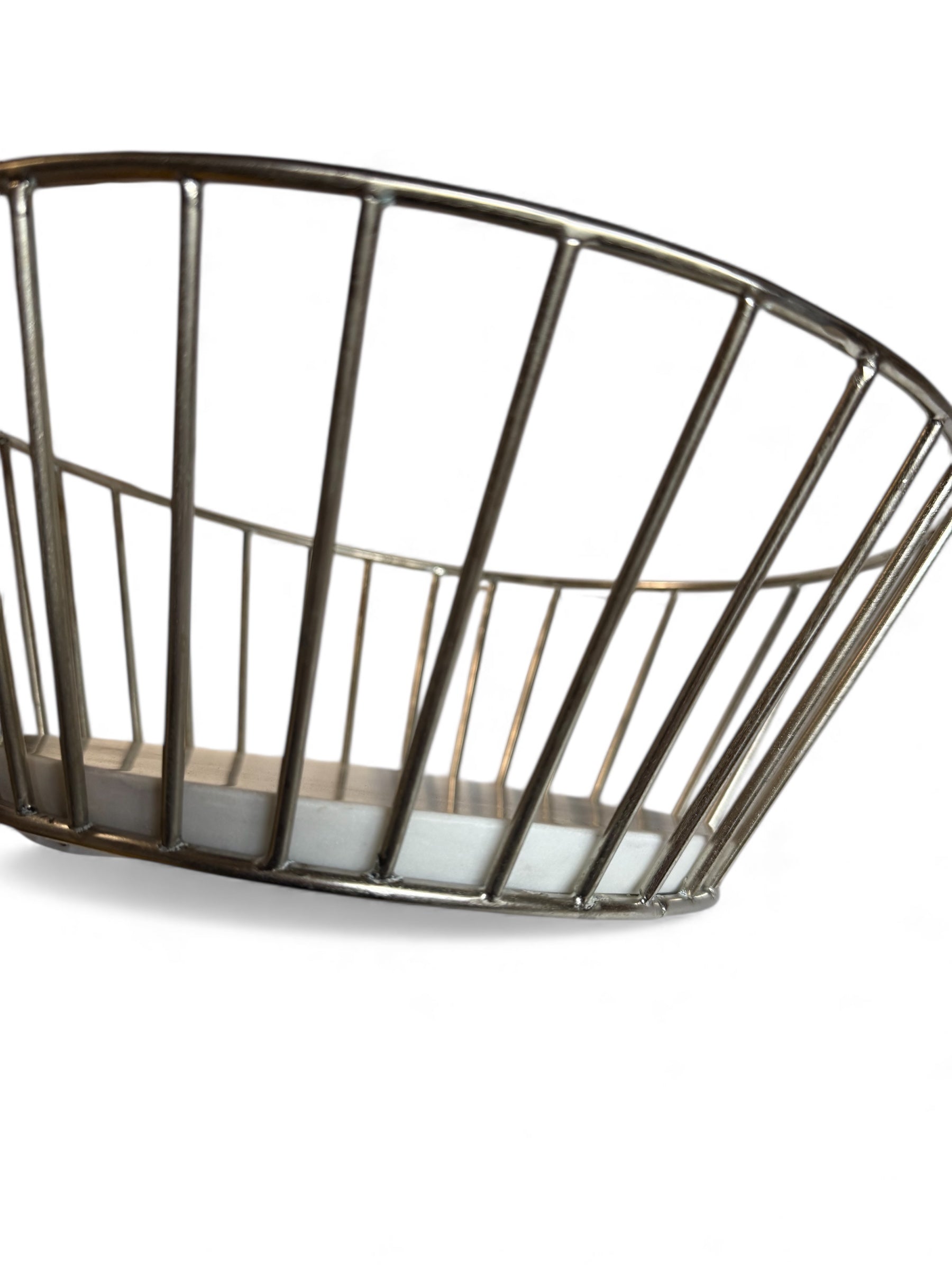 This elegant bread basket combines a sleek silver wire design with a striking white marble base, measuring 12 inches across and standing 4.5 inches tall.